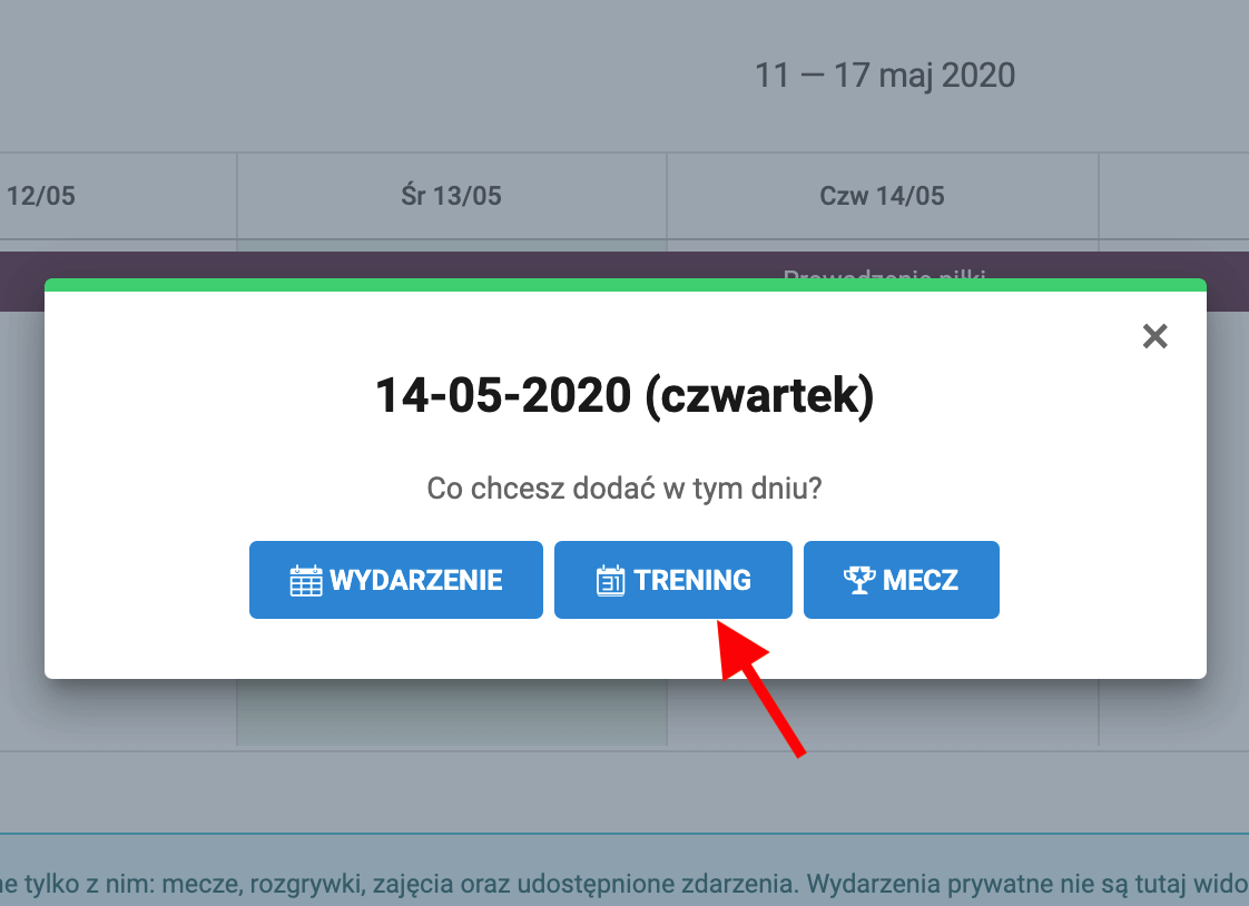 Aby utworzyć trening przejdź w lewym menu do zakładki dziennik podsumowanie, następnie kliknij w dowolny dzień na kalendarzu drużyny i wybierz "trening" w okienku, które pojawi się na ekranie.
